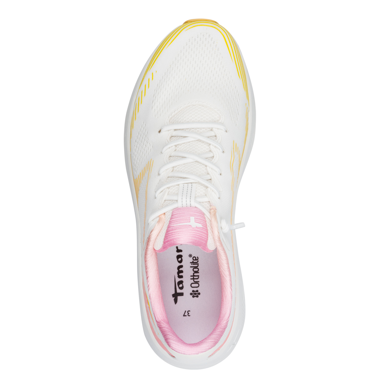 Τα Tamaris γυναικεία λευκά sneakers 1-23781-45-1B7 συνδυάζουν σύγχρονο σχεδιασμό και καθημερινή άνεση. Ο συνδυασμός υφάσματος και συνθετικού υλικού προσφέρει ελαφριά εφαρμογή και ευχάριστη αίσθηση στο περπάτημα. Η τεχνολογία ORTH/Rem.Footbed στη σόλα συμβάλλει σε καλύτερη στήριξη και σταθερότητα. Η σφηνοειδής σόλα ύψους 4 cm προσθέτει διακριτική κομψότητα, ενώ το κλείσιμο με κορδόνια και η στρογγυλή μύτη ολοκληρώνουν ένα sneaker ιδανικό για καθημερινές casual εμφανίσεις.